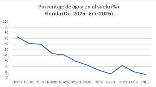 Bidegain compartió datos del porcentaje de agua en el suelo en el departamento de Florida, donde ha estado “sistemáticamente a la baja”, más allá de un breve respiro tras la primera semana de enero. Explicó que, desde octubre de 2025 a enero de 2026, de acuerdo al balance hídrico seriado, evolucionó sistemáticamente a la baja desde 70% a 8%, con una recuperación a 21% en la primera semana de enero, pero volviendo a bajar posteriormente al 7%.