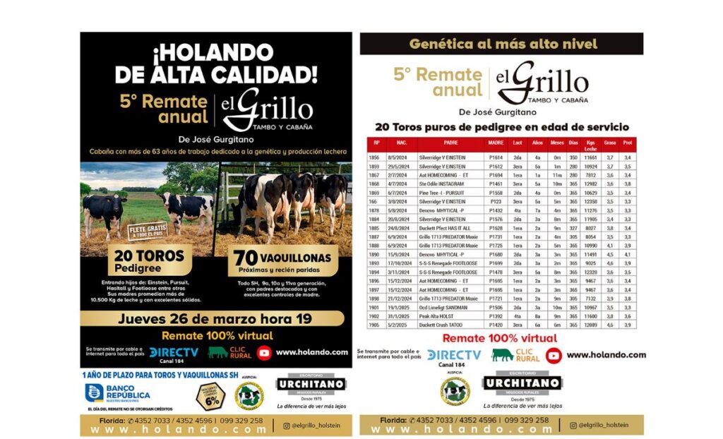 Para la hora 19.00 del jueves 26 de marzo está programado Holando de calidad, el 5° remate anual de la cabaña El Grillo, de Gurgitano, con una historia de más de 63 años dedicados a la producción lechera y al mejoramiento genético.