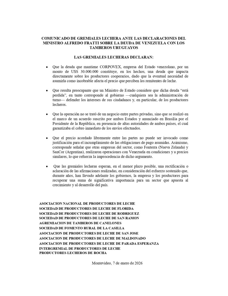 Las recientes declaraciones del ministro Luis Alfredo Fratti en las que señaló que la deuda de US$ 30.000.000 de la Corporación Venezolana de Comercio Exterior (Coprovex) con la lechería uruguaya “está perdida”, tuvieron respuesta de las gremiales lecheras a través de un comunicado conjunto.