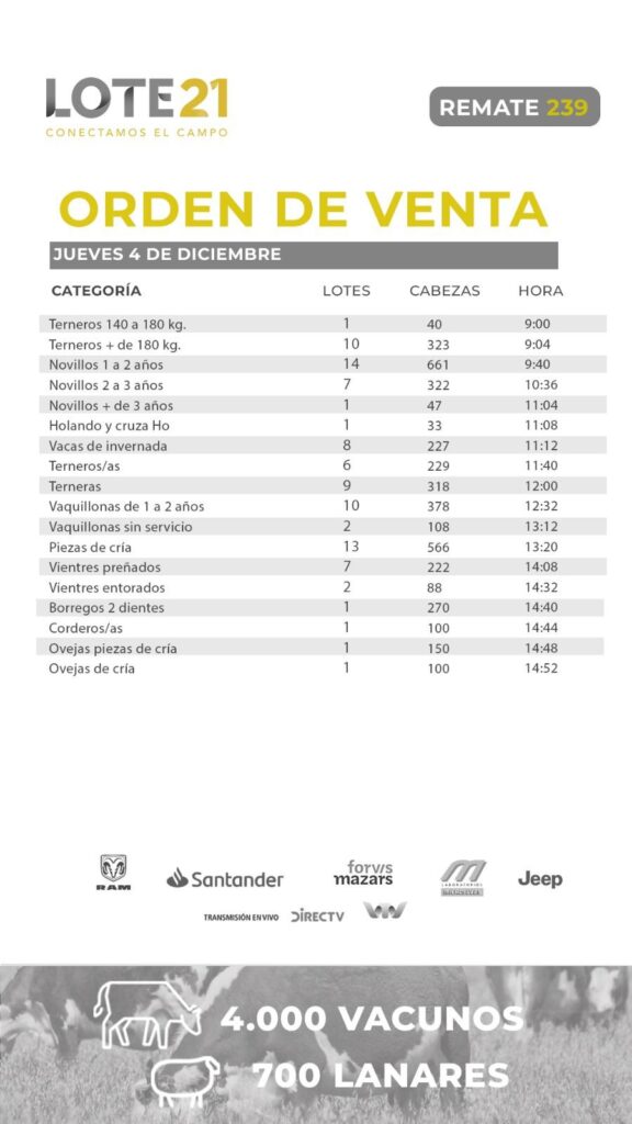Una oferta de 4.000 vacunos y 700 lanareas, desde la mañana del jueves 4 de diciembre, hace al remate 239 de Lote 21. Roberto Mateu Méndez, integrante y rematador de Ganadera del Norte, describió las características de la oferta, su orden, y se refirió a los lotes que presenta el escritorio.