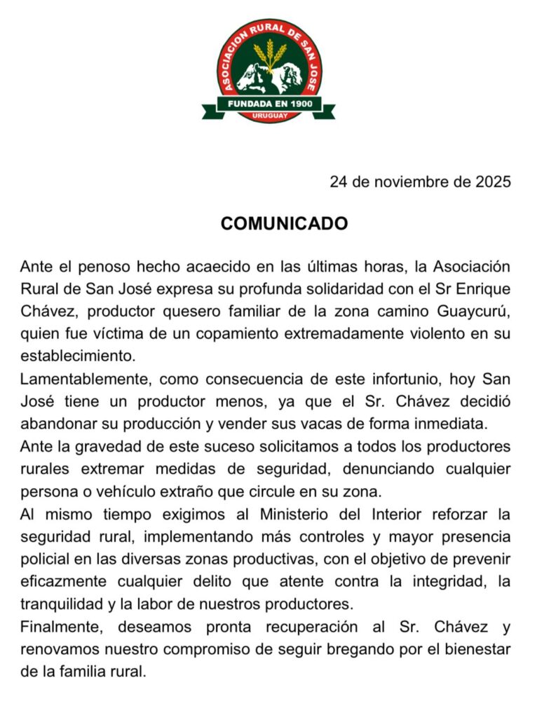La Asociación Rural de San José manifestó, a través de un comunicado, su “profunda solidaridad” con el productor quesero familiar Enrique Chávez, de la zona camino Guaycurú, tras ser este víctima de “un copamiento extremadamente violento en su establecimiento”.